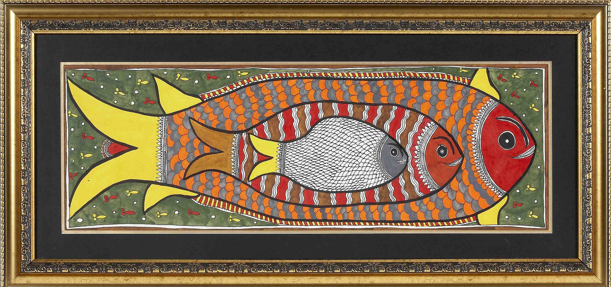 Madhubani Painting Fish Pond Framed ( 17inch x 36 inch)