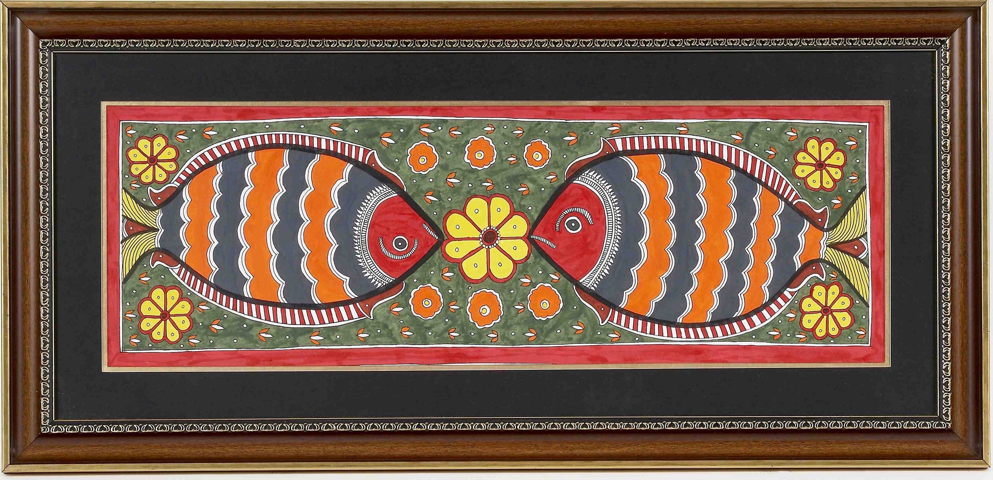 Madhubani Painting Pair Of Meeting Of The Birds By Baua Devi (17inch x 36 inch- Free Shipping)