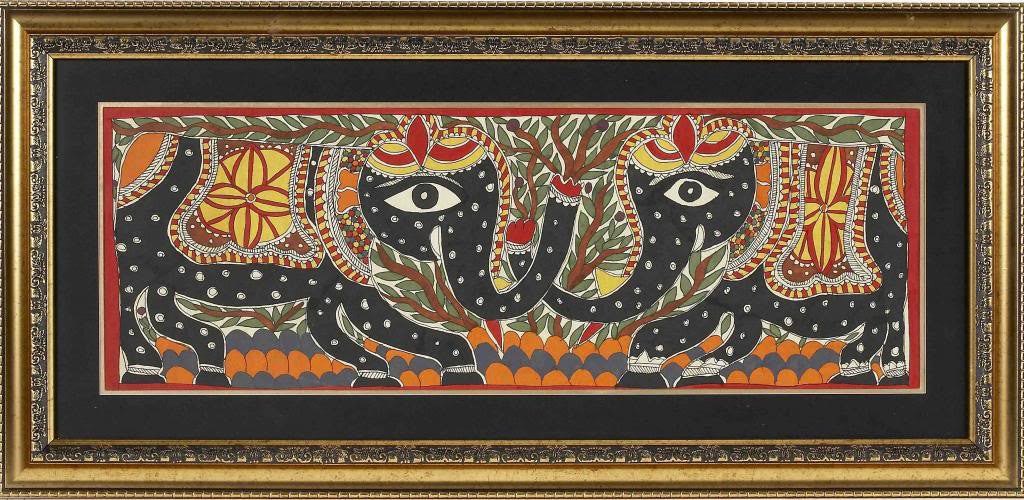 Madhubani Painting Pair Of Elephant With Trunk Up By Baua Devi