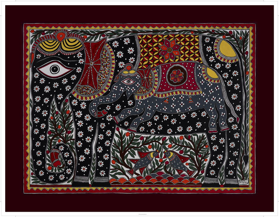 Mother Elephant Carrying Fully Gown Calf in Her Belly Madhubani Painting By Baua Devi