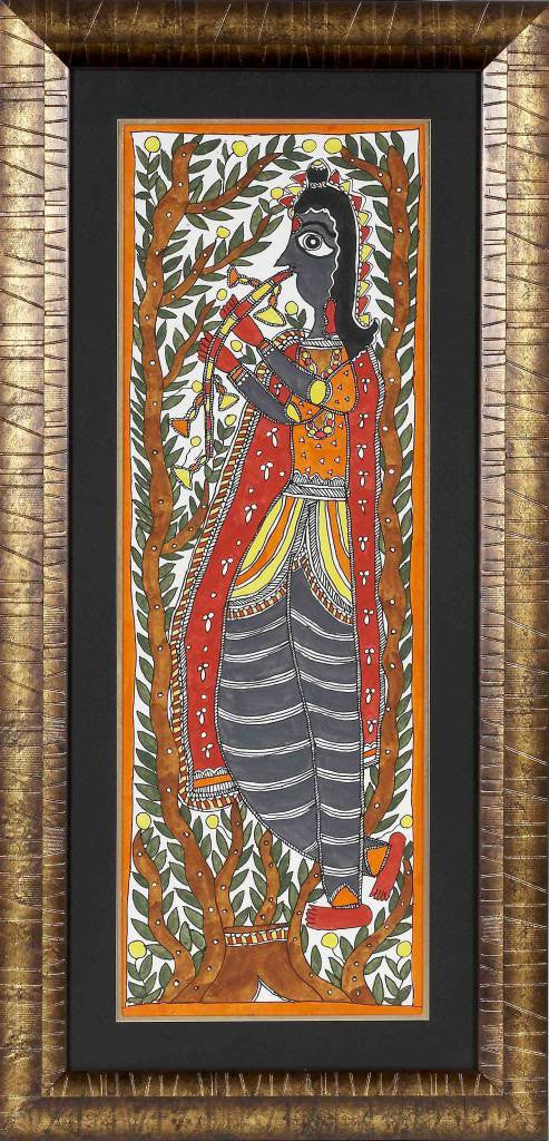 Madhubani Painting Kirishna Playing Flute ( Free Shipping)Artist : Baua DeviSigned by the Artist